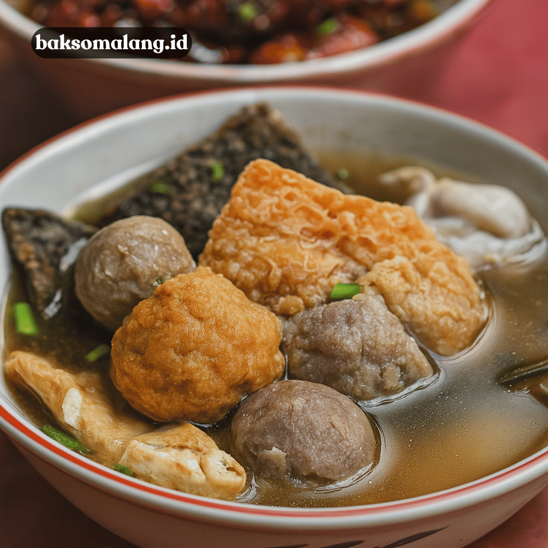 Rasa kuah yang sedap dan varian isian lengkap seperti paru goreng, usus ayam, dan babat menjadikannya pilihan tepat bagi pecinta bakso otentik khas Malang.